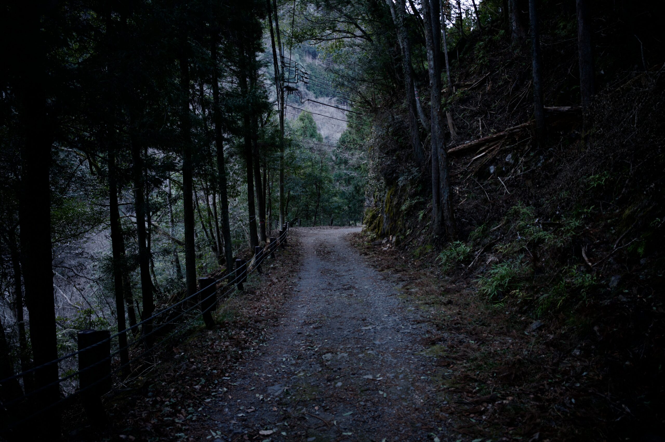 朝方の薄暗い林道。雰囲気があります。