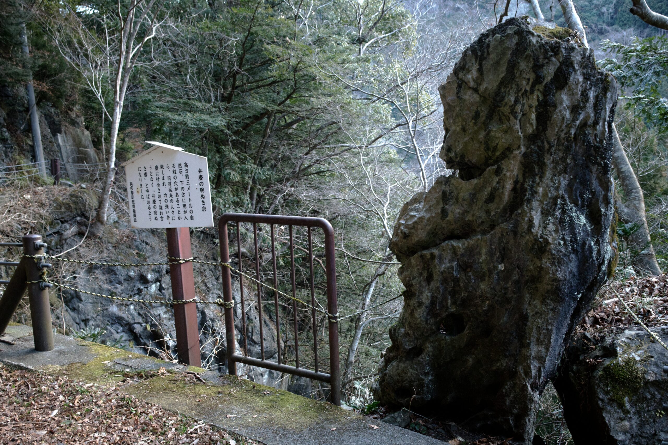 白髭神社から少し進んだ先にある『弁慶の腕ぬき岩』。写真では分かりにくいですが、丸い穴が開いています。