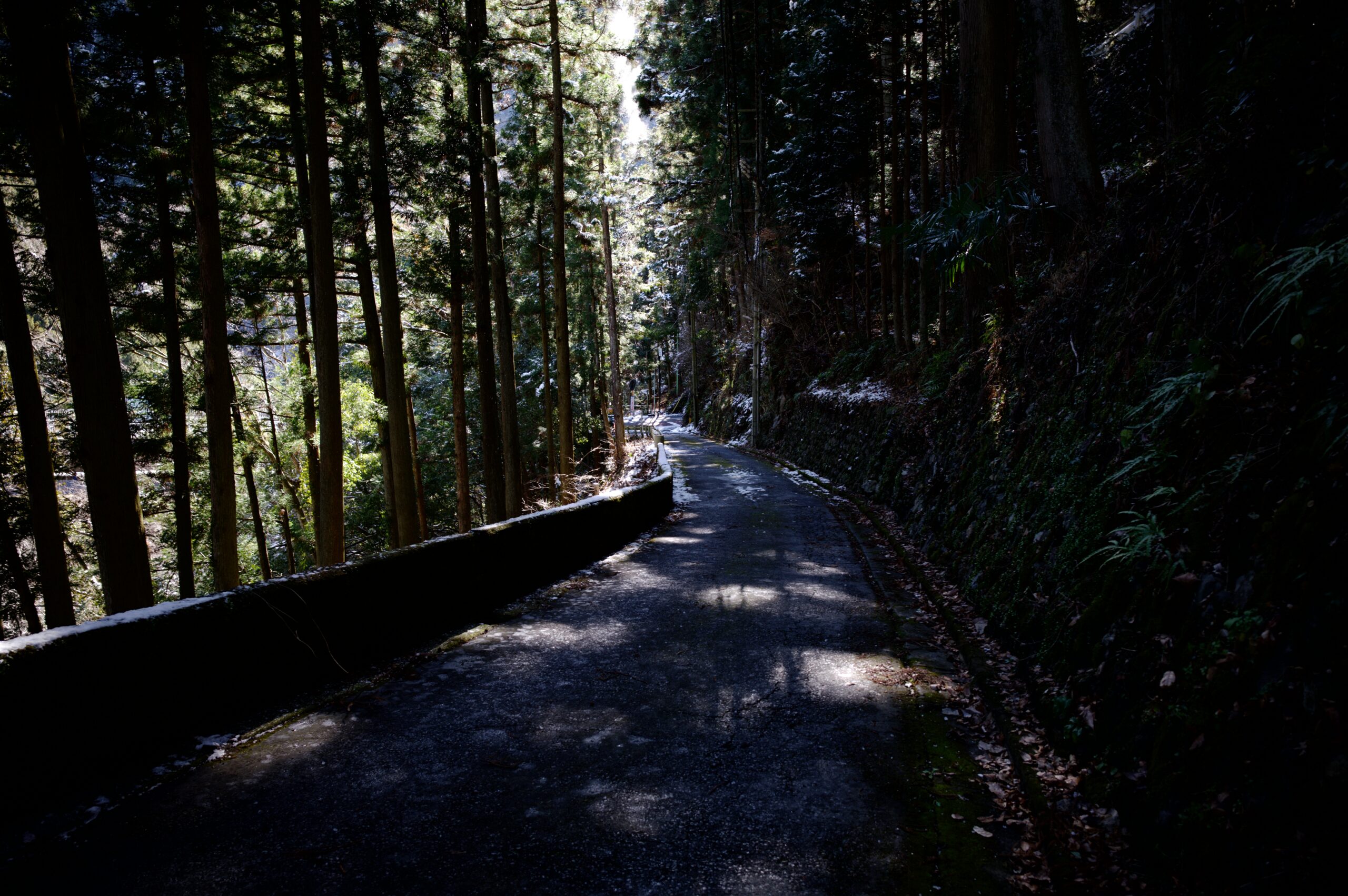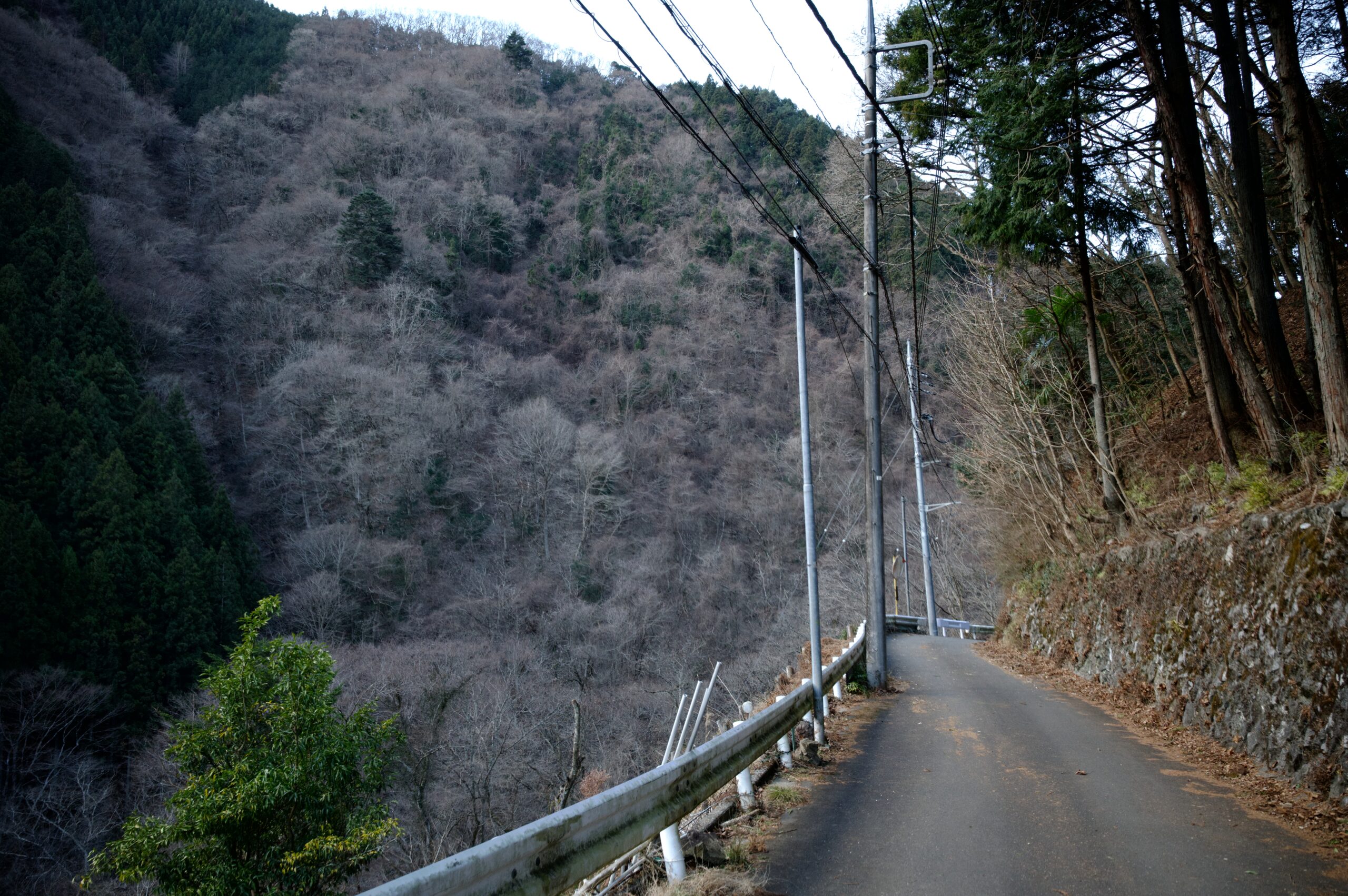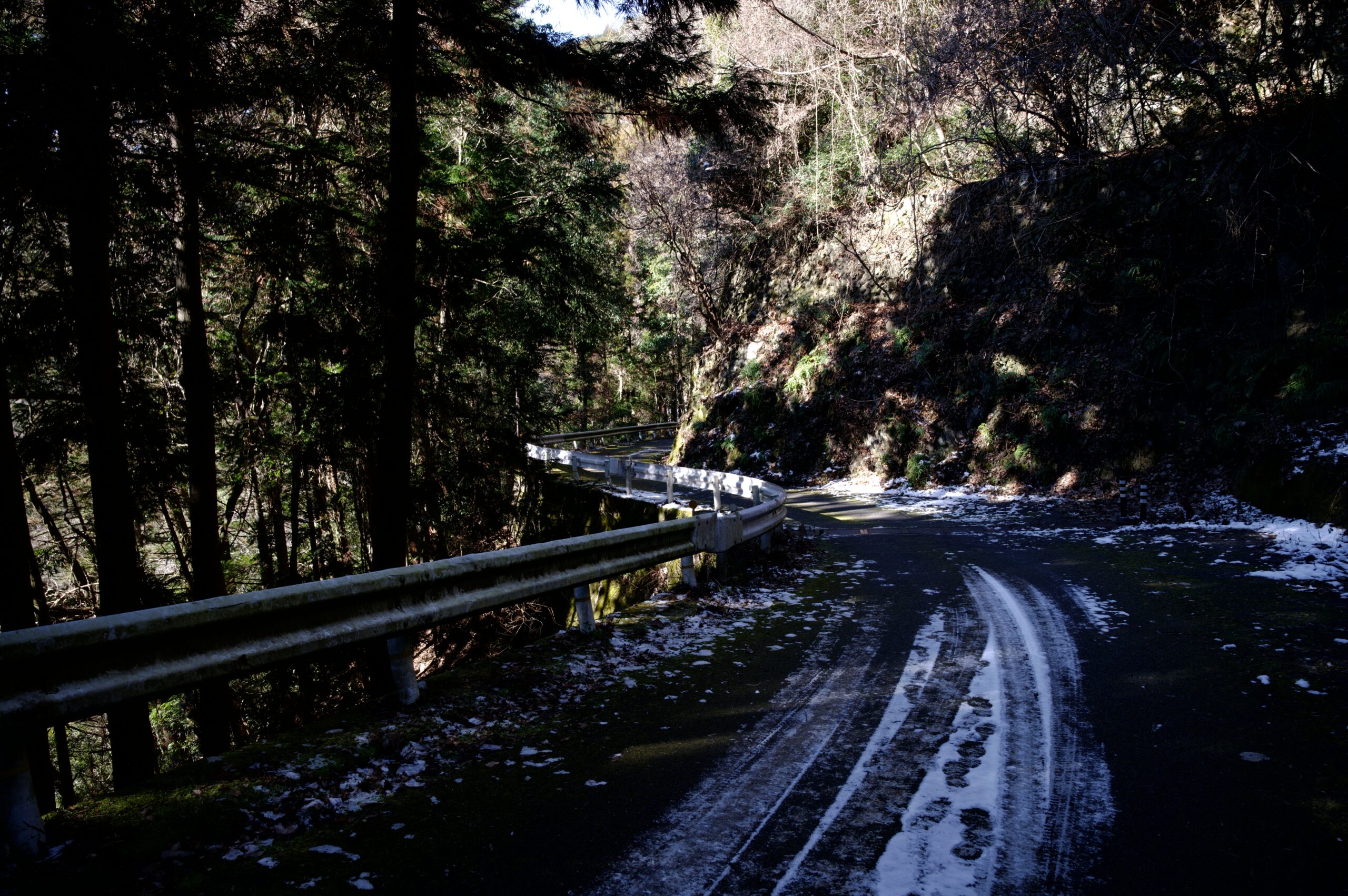 ガードレール下から眺める林道。