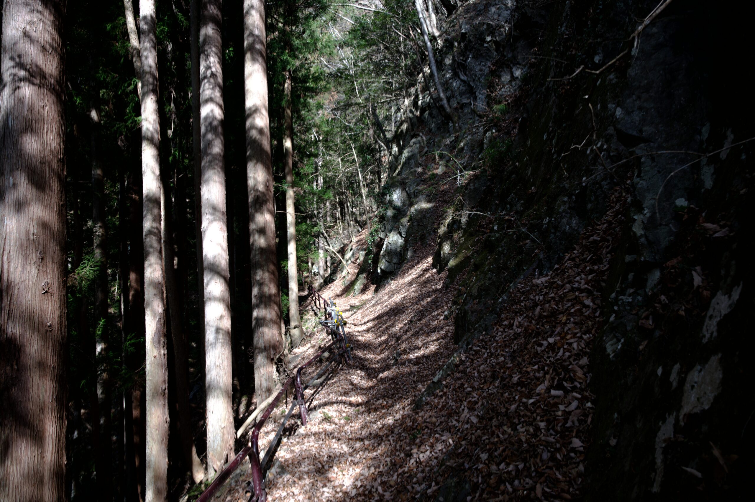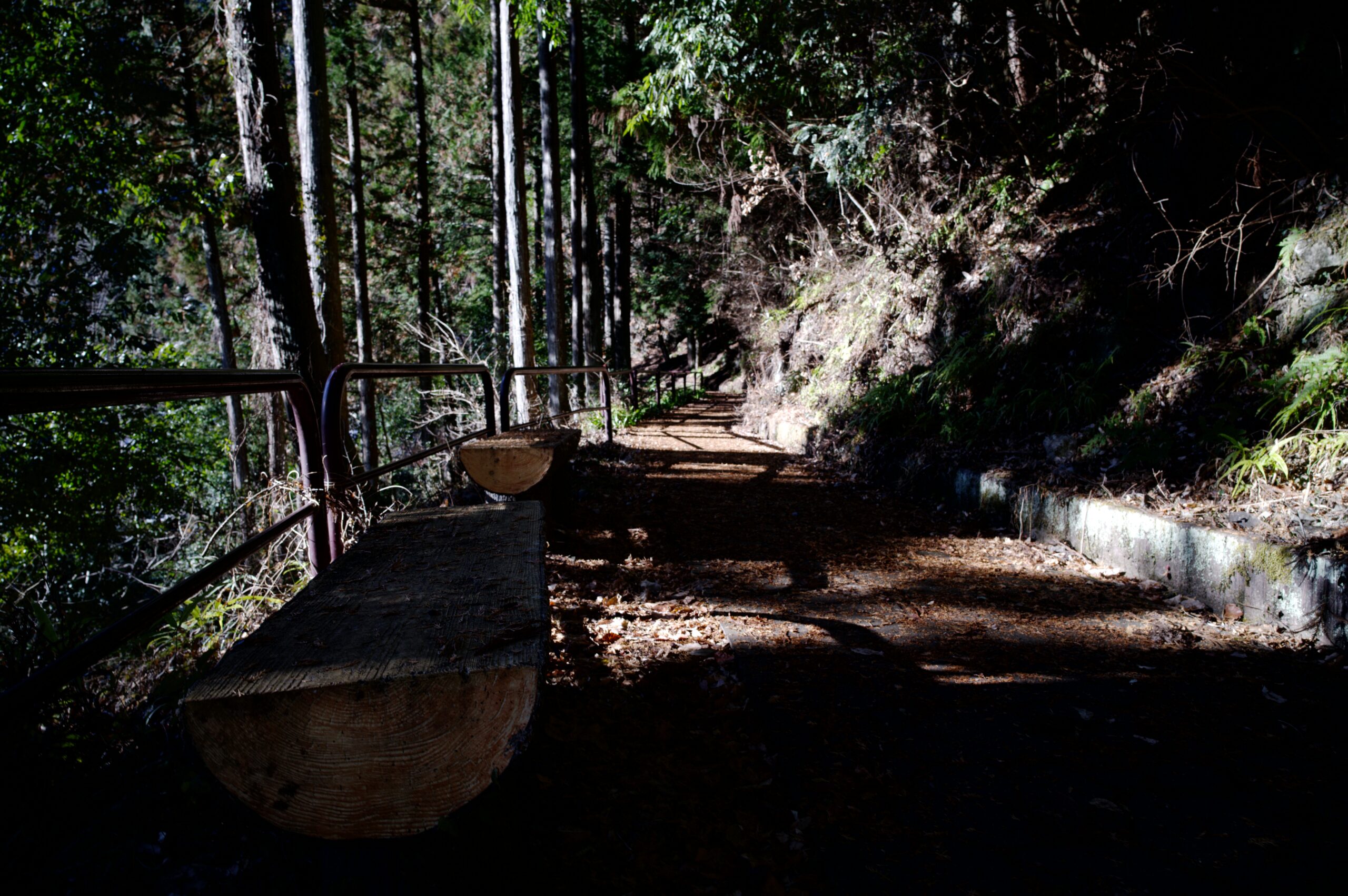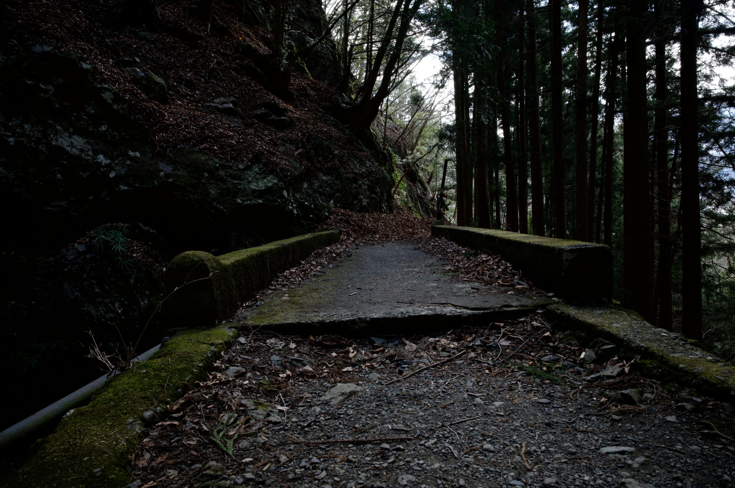 ガードレール下から眺める林道。