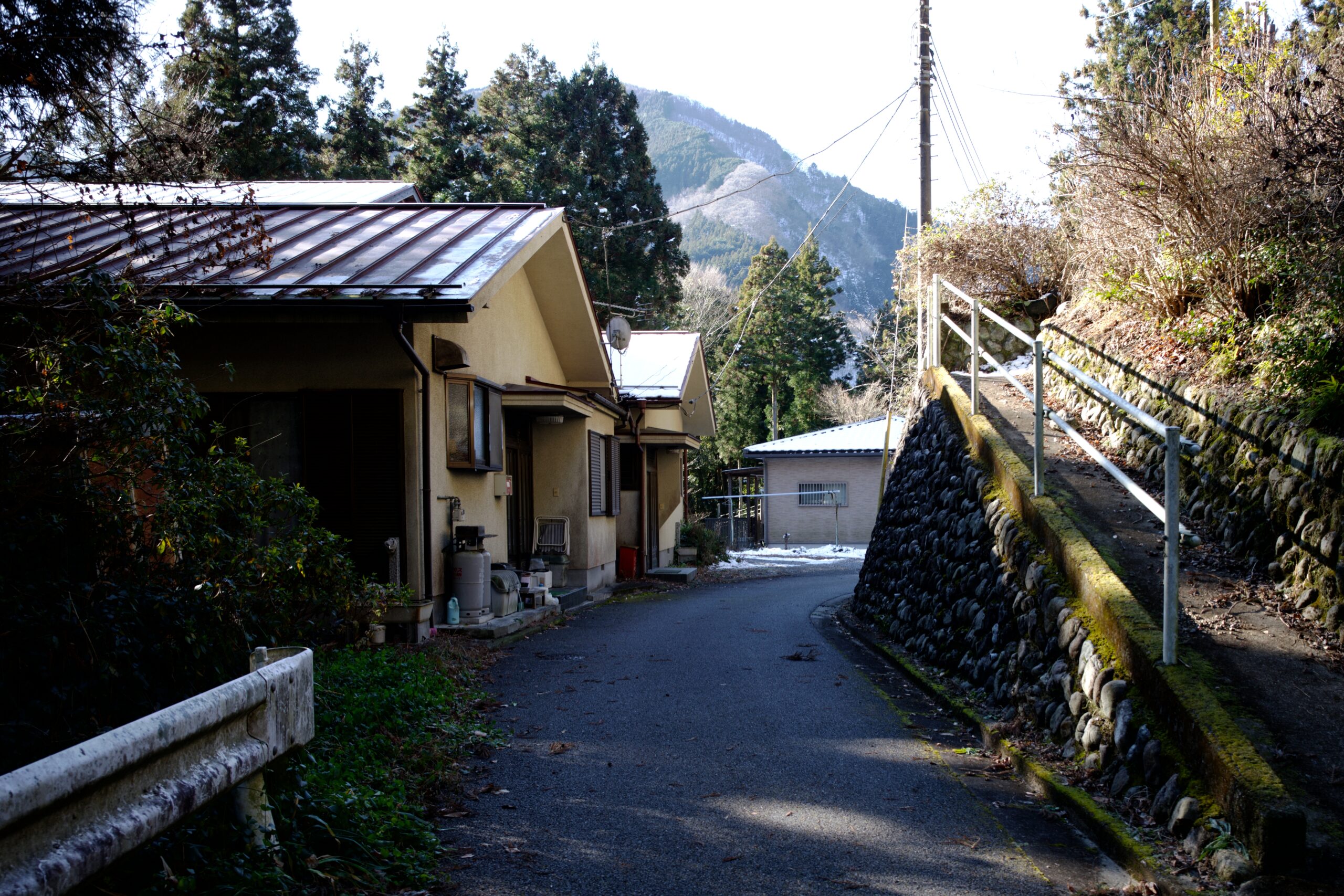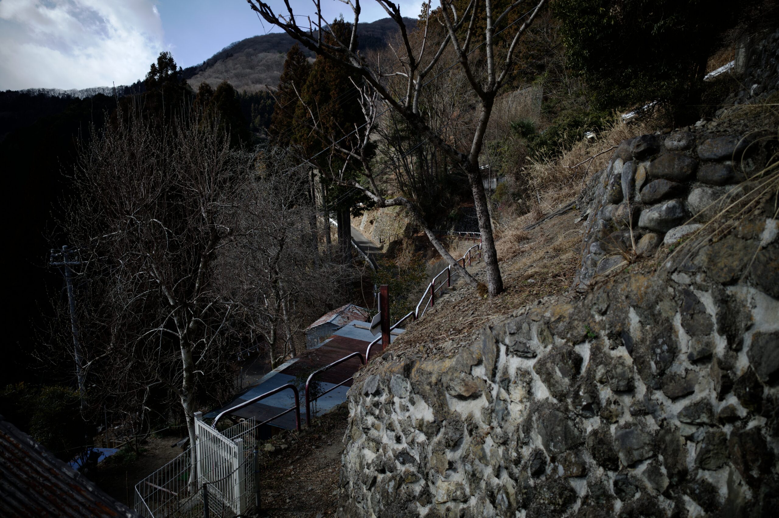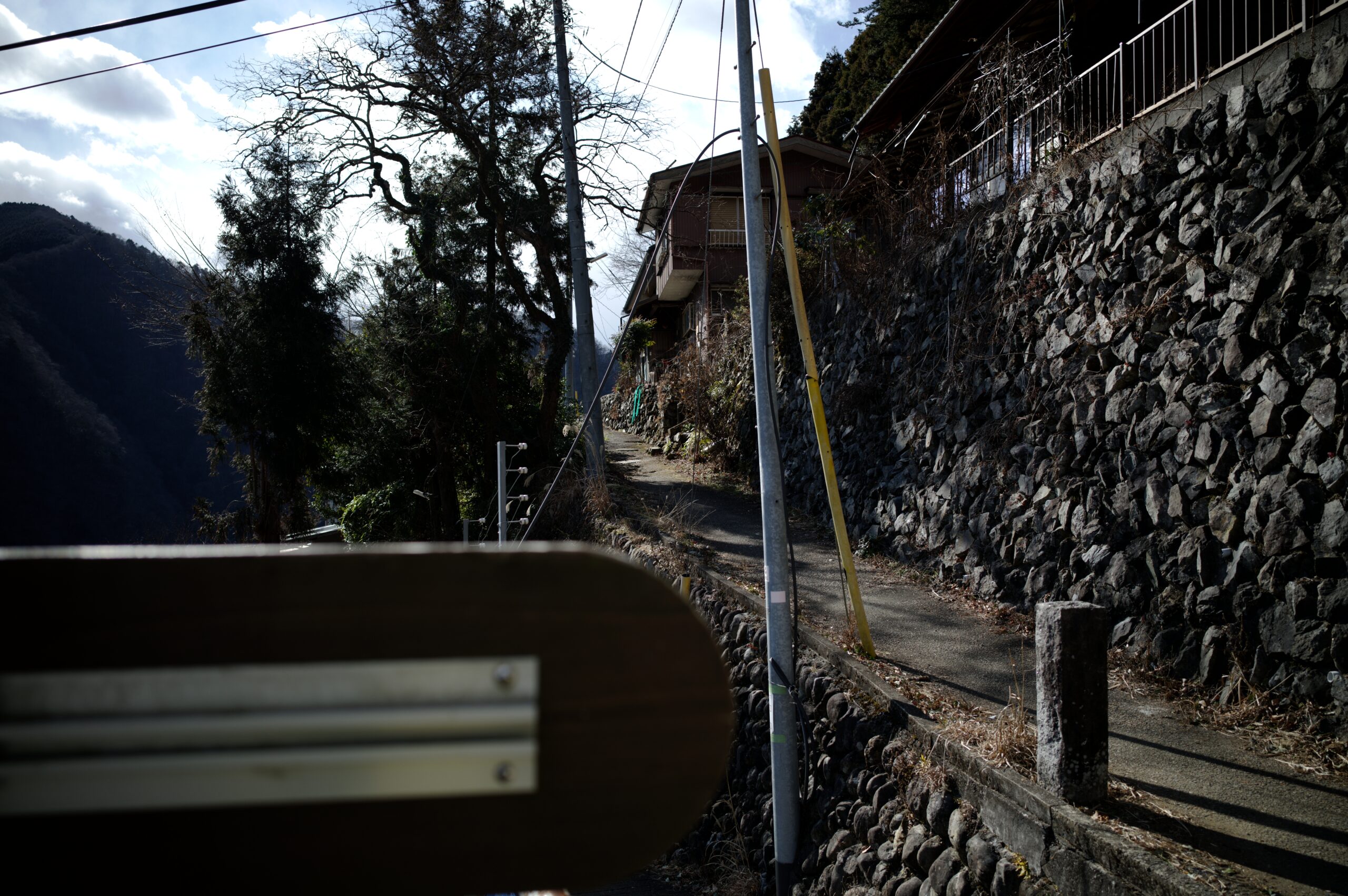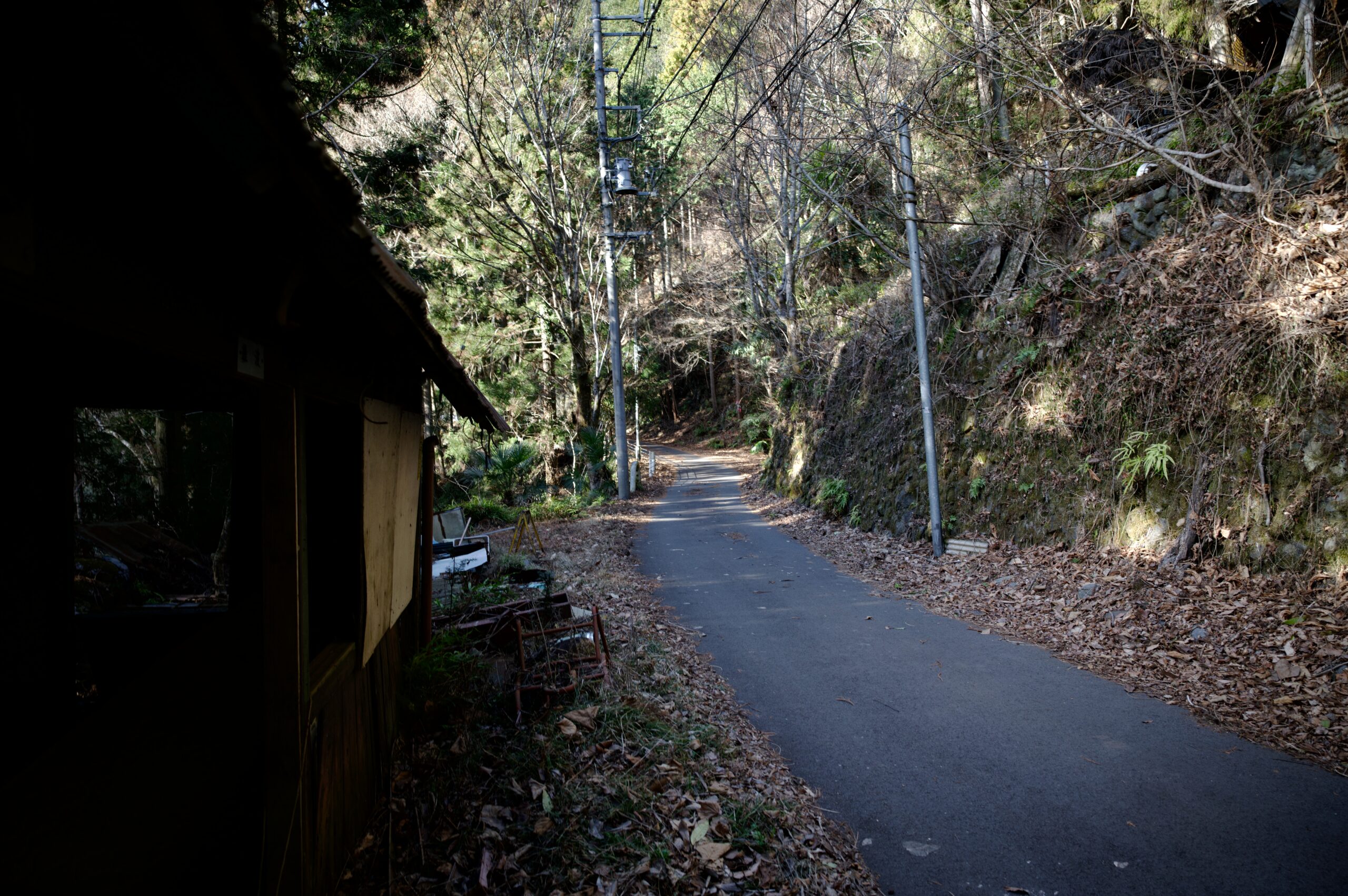 奥多摩むかし道はまだまだ続きます。しだくら吊橋を越えて更に進むと、壊れた古い民家が並んでいました。