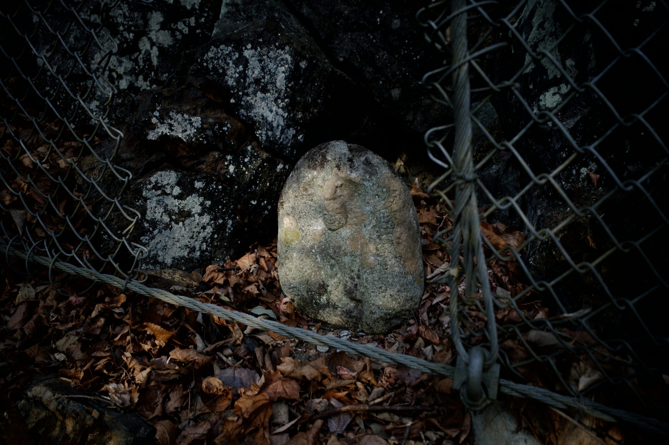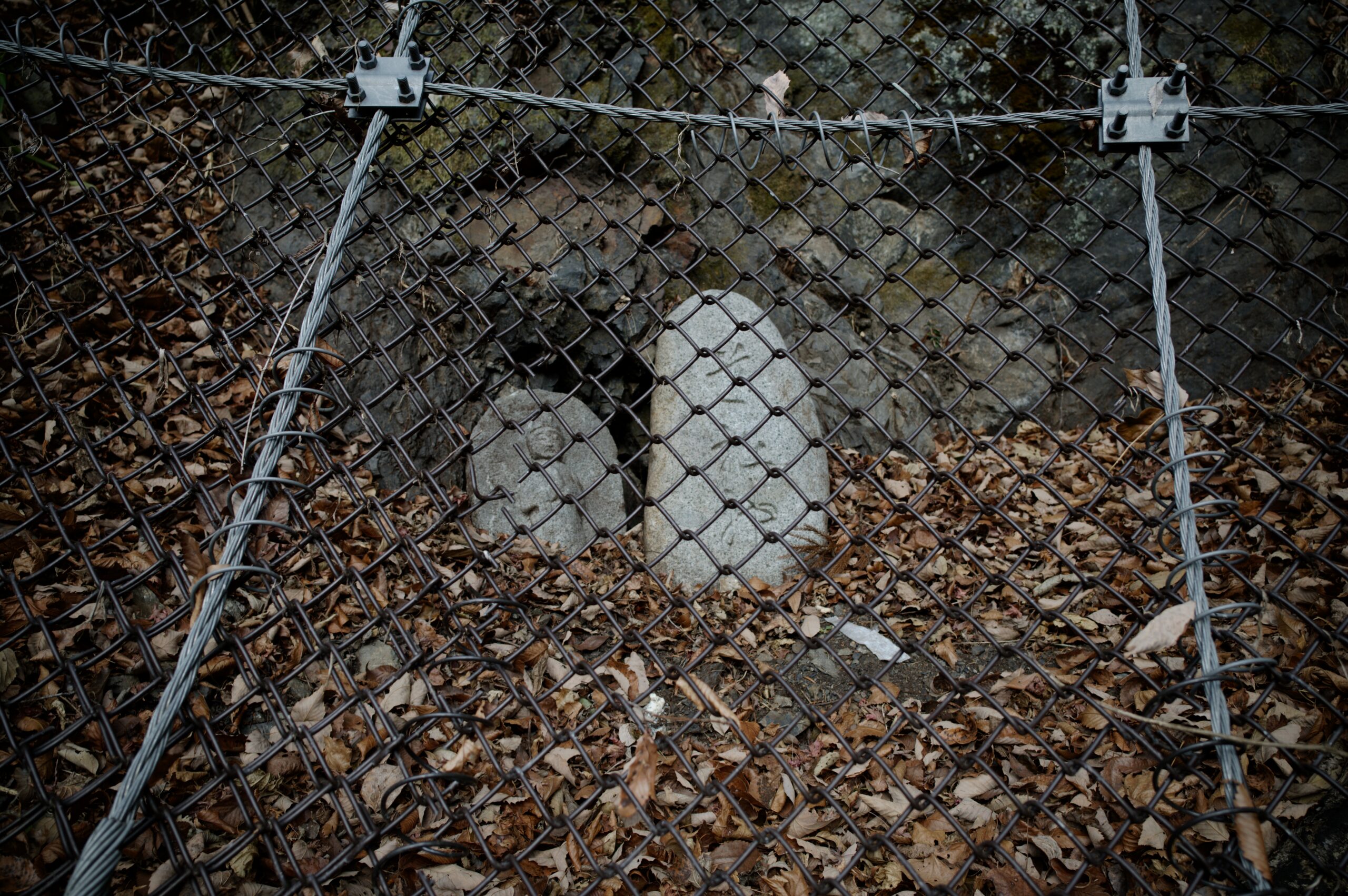 落石防止網の向こうに『道祖神』。