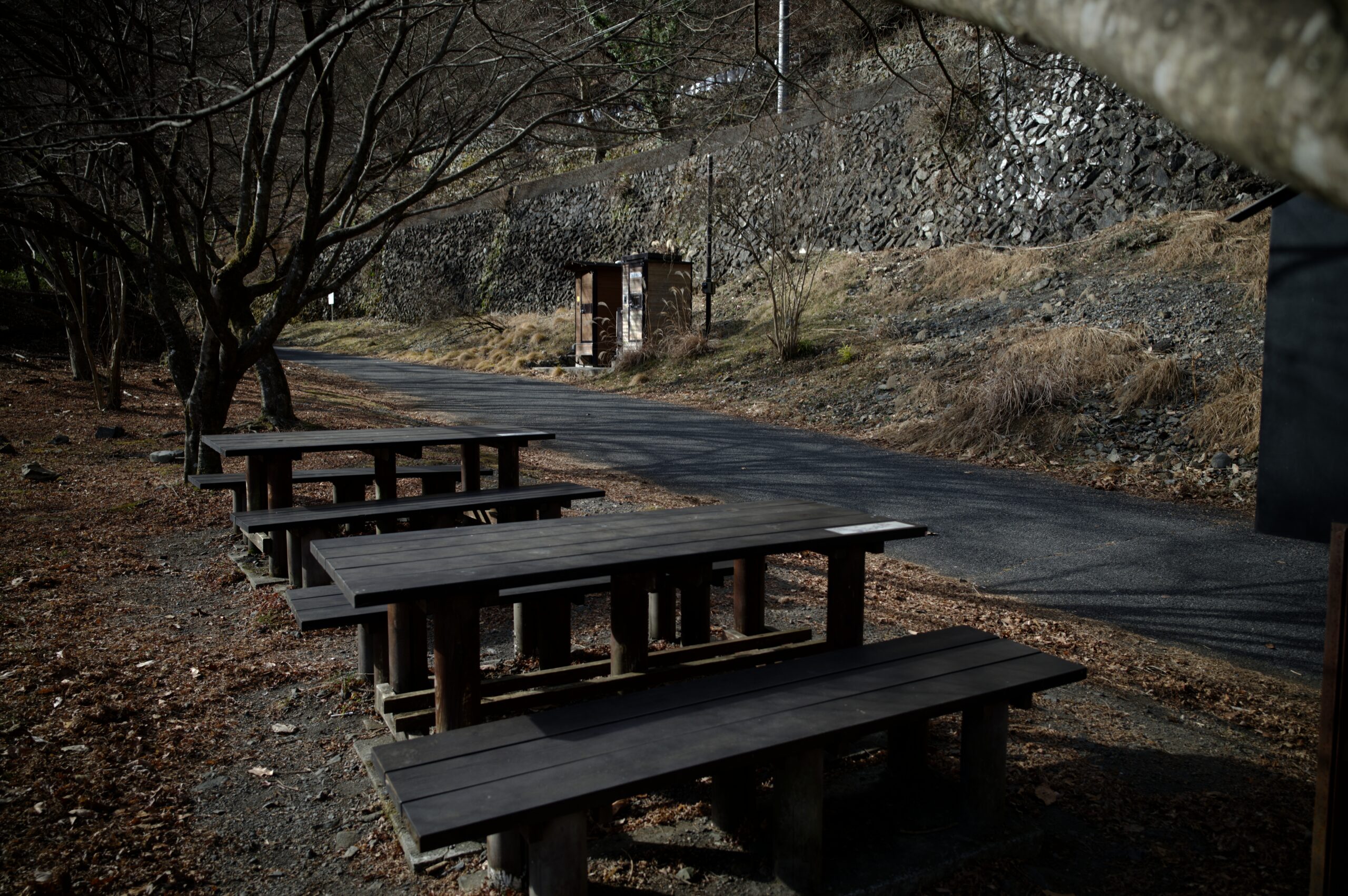 『西久保の切り返し』付近のベンチ。バイオトイレは鍵が掛かっていて使用不可。