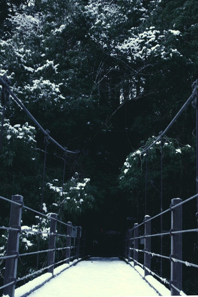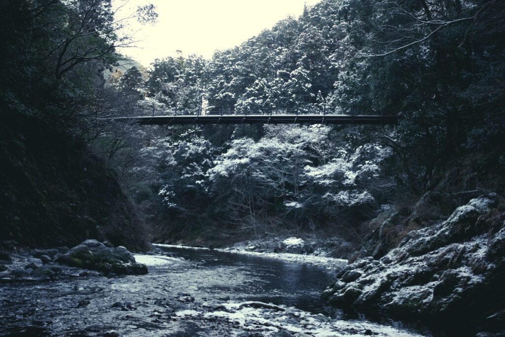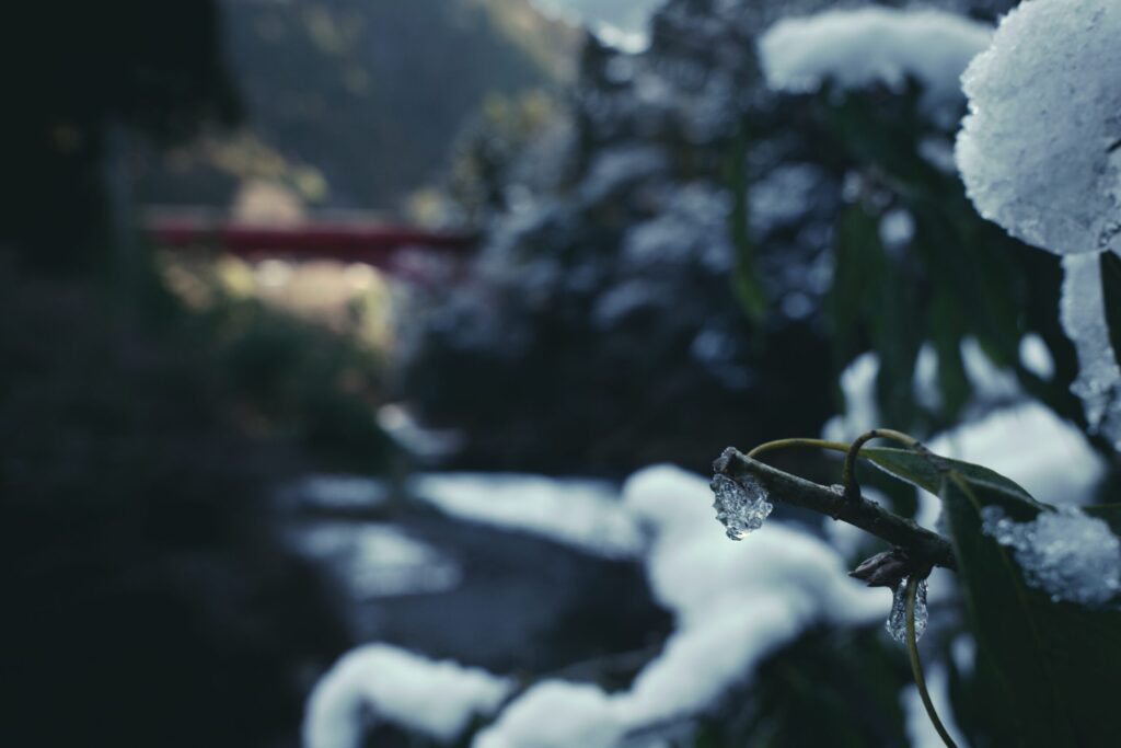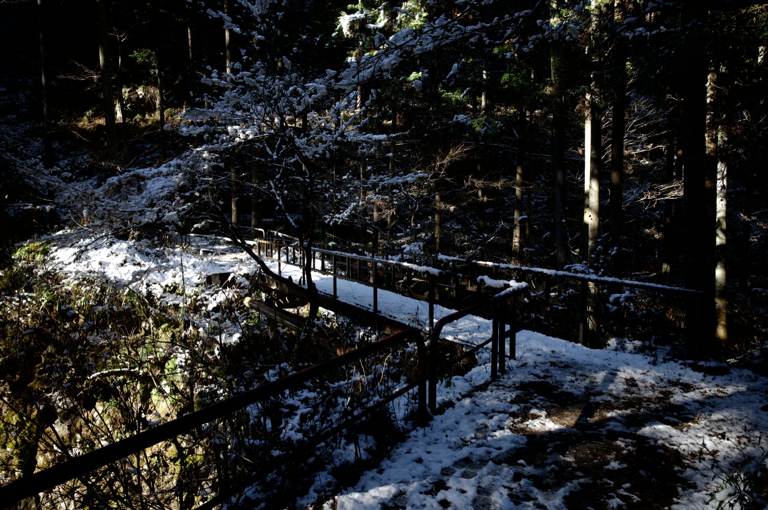 雪を被りながら逞しく生きる常緑性の針葉樹。氷を纏った橋の欄干。それに秋に枯れ落ちて地面を覆う葉など、目を凝らさなければ見逃してしまうような魅力的な被写体が、氷川渓谷の遊歩道には沢山。