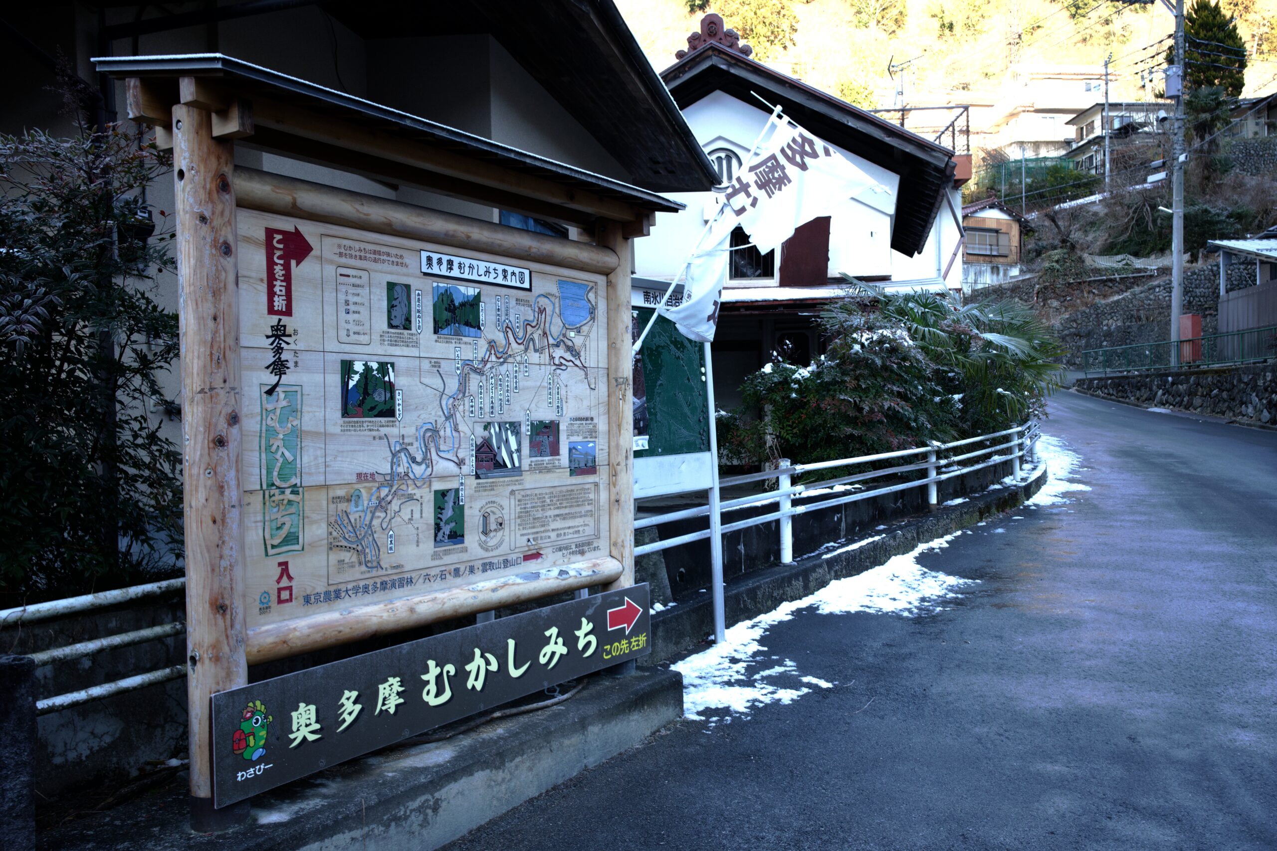 奥多摩むかし道のはじまりは、駅から直ぐの氷川大橋を渡った少し先。角に写真のような看板が立っています。