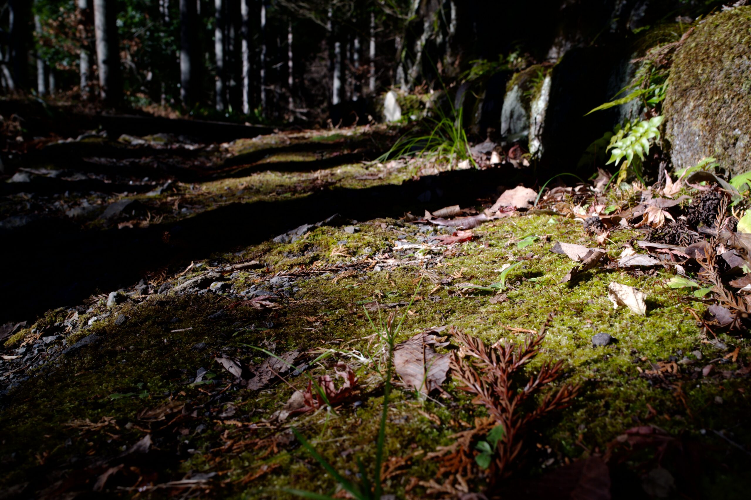 下り基調の林道。苔生す石壁を楽しみながら