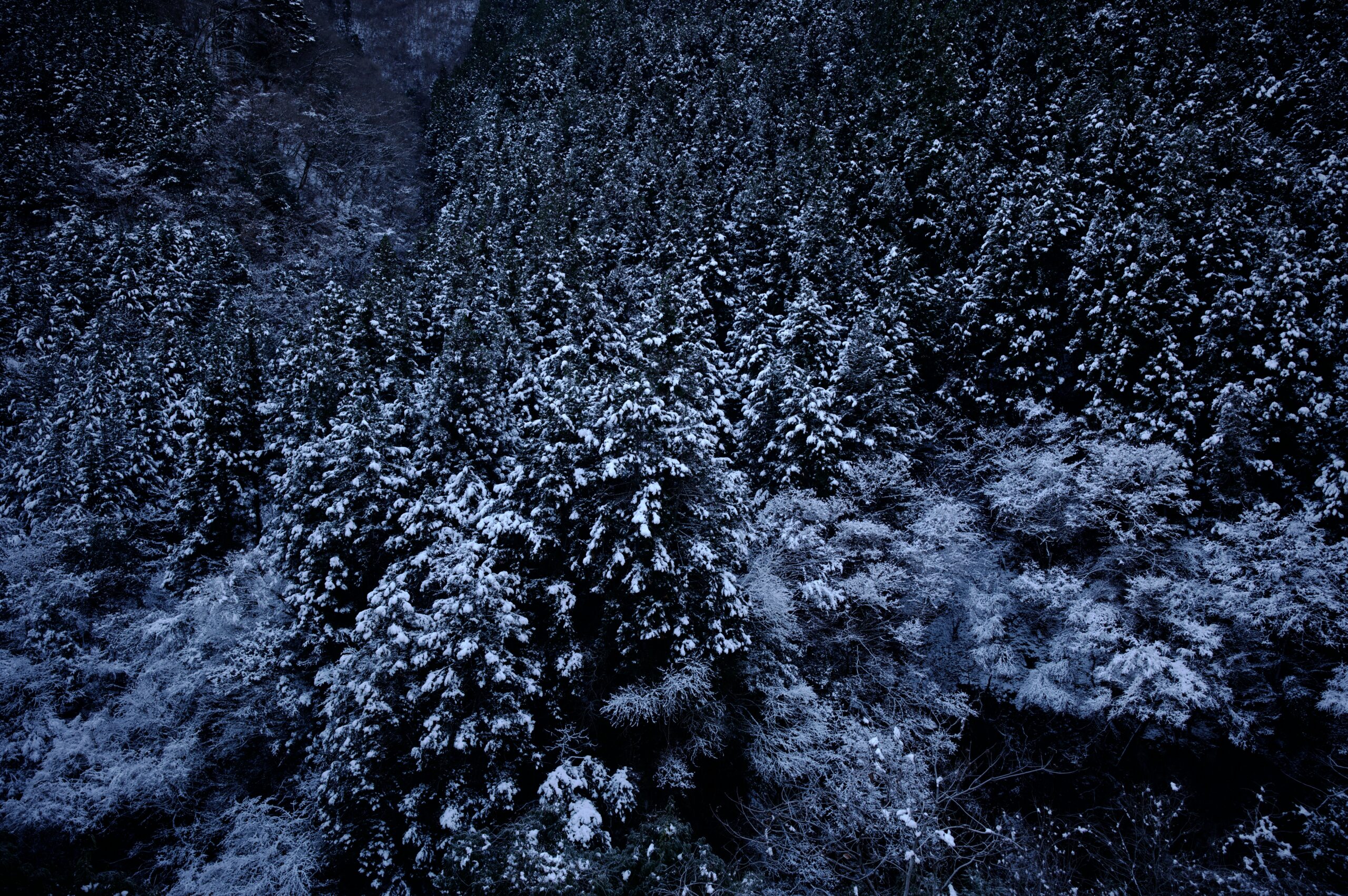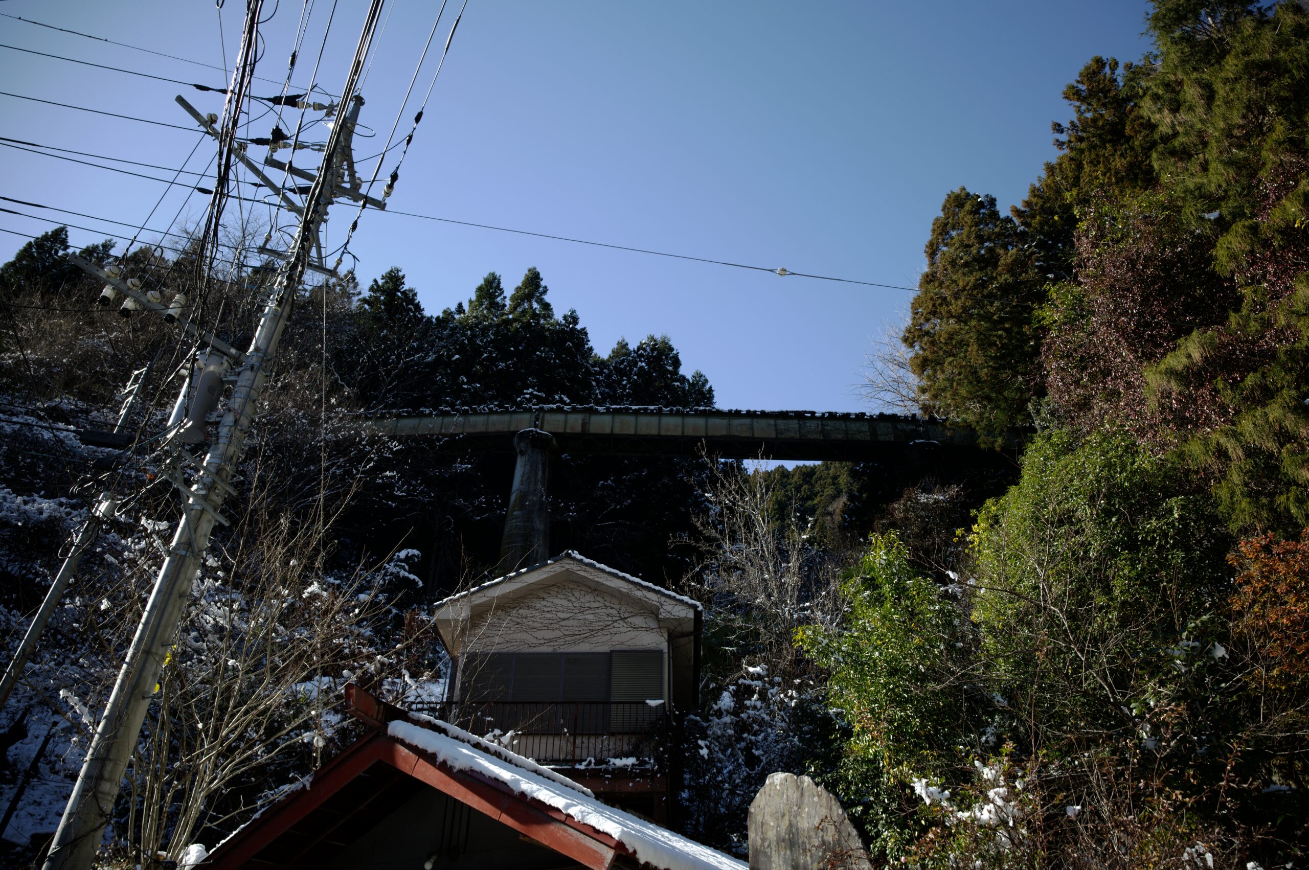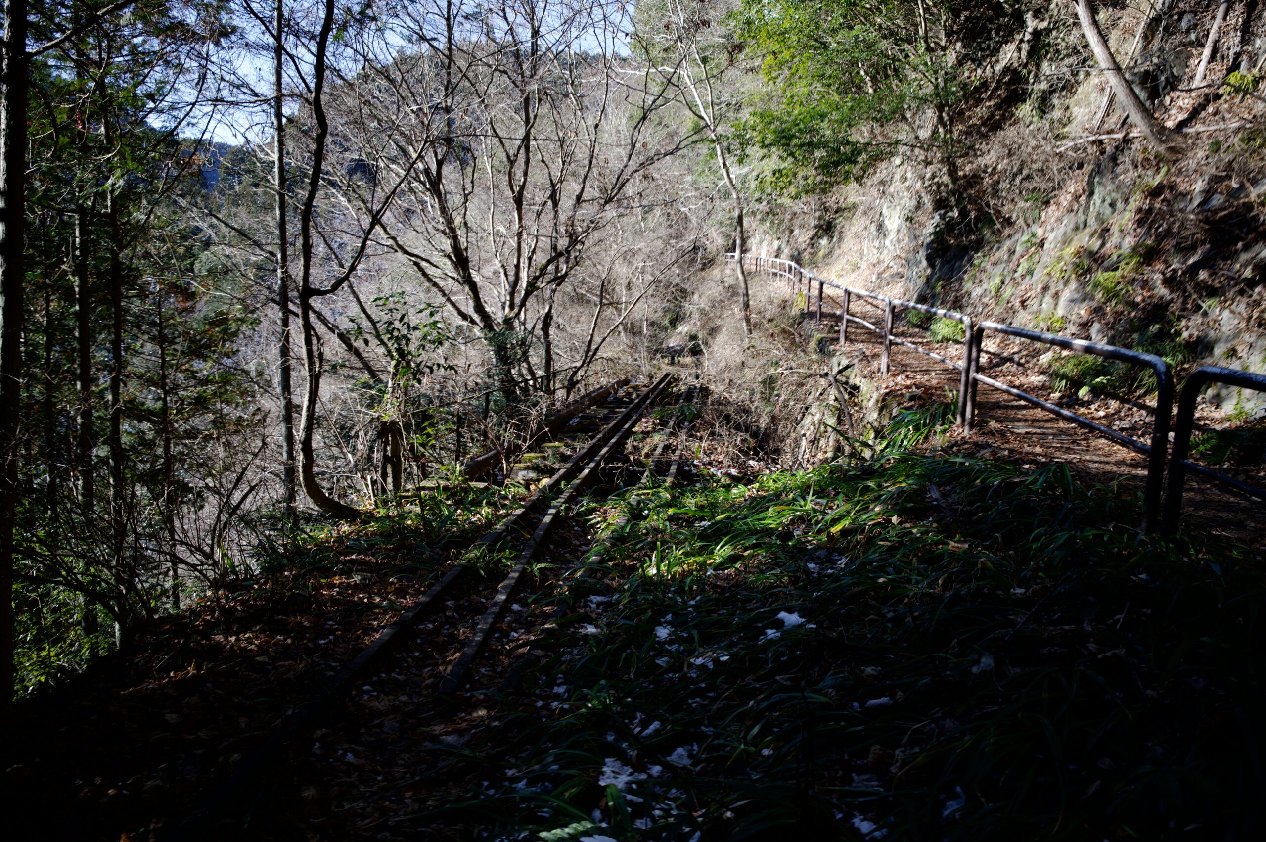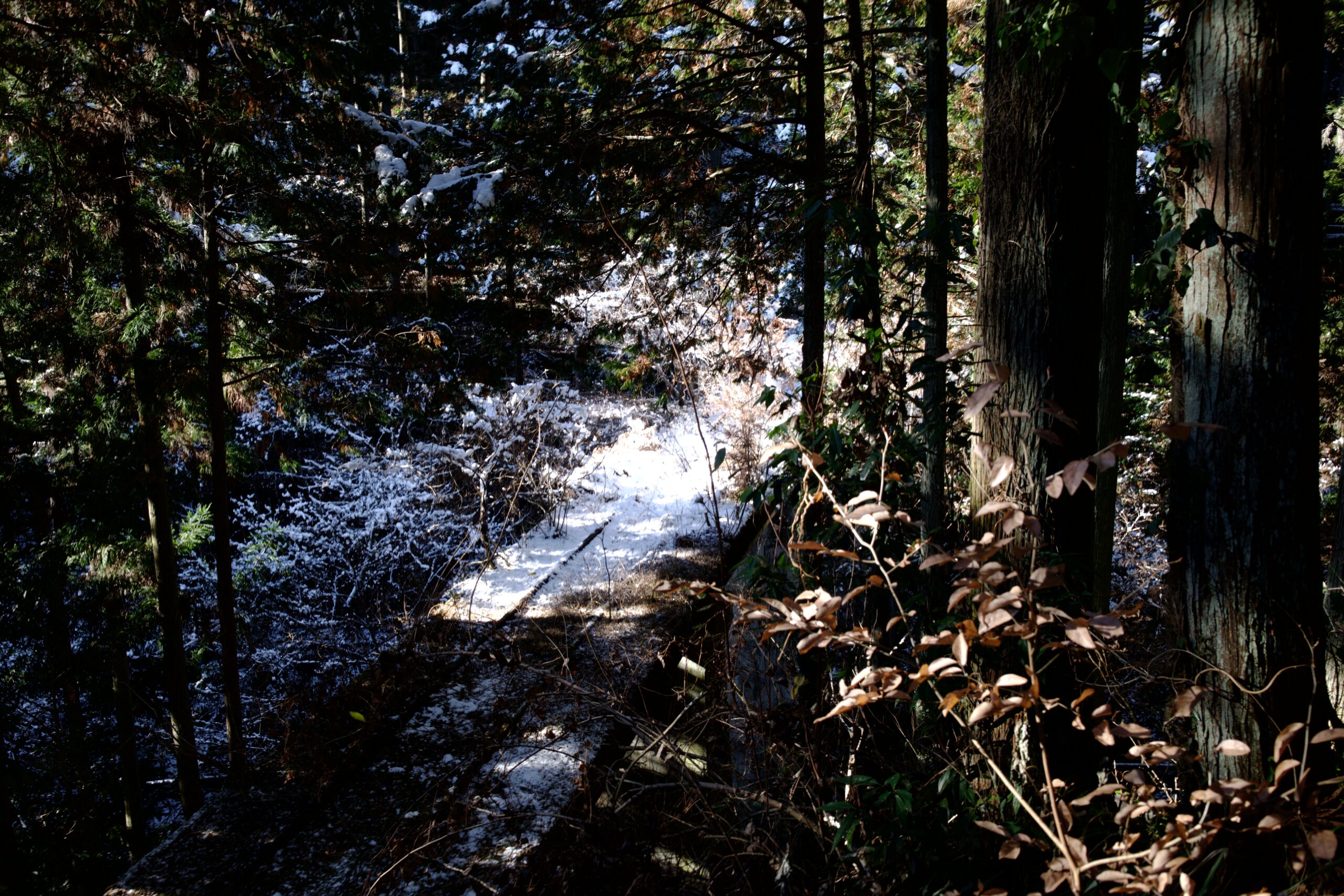 杉の間から、雪を被った軌条跡。