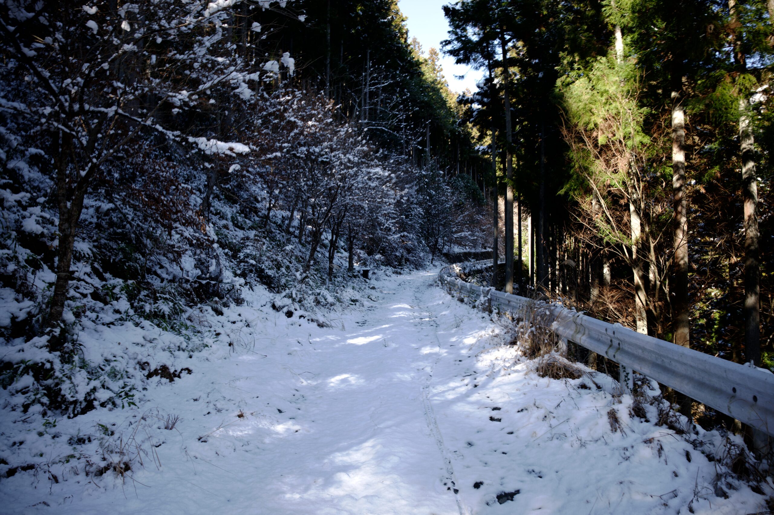 林道に出ると、この景色。ガードレールを挟んで左右の景色が、全くの別世界です。こういった景色に出会えるのも、降雪後にする散策の魅力でしょうか。