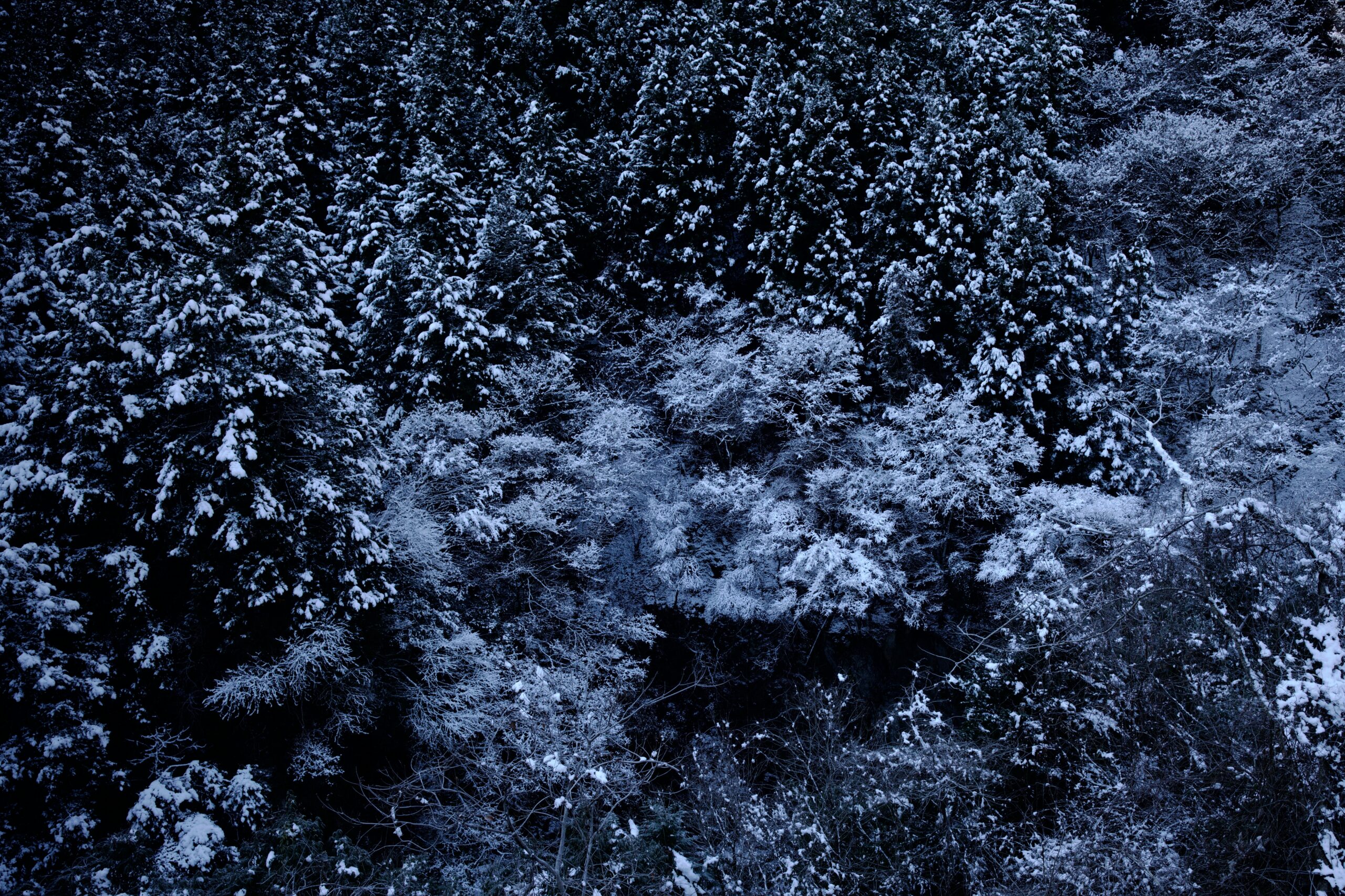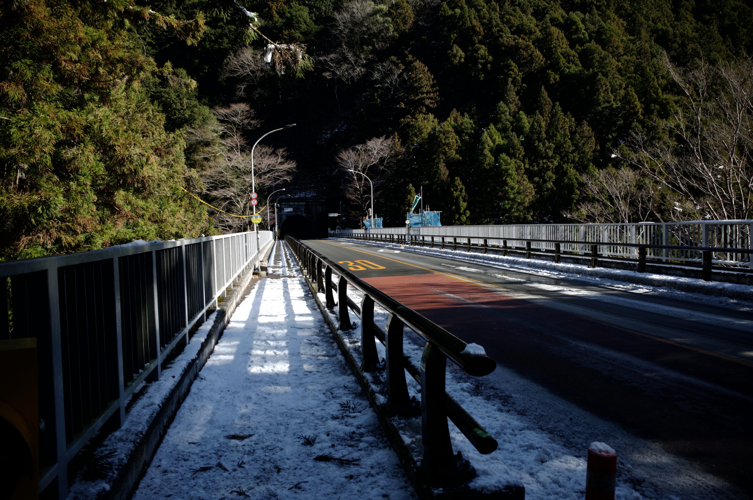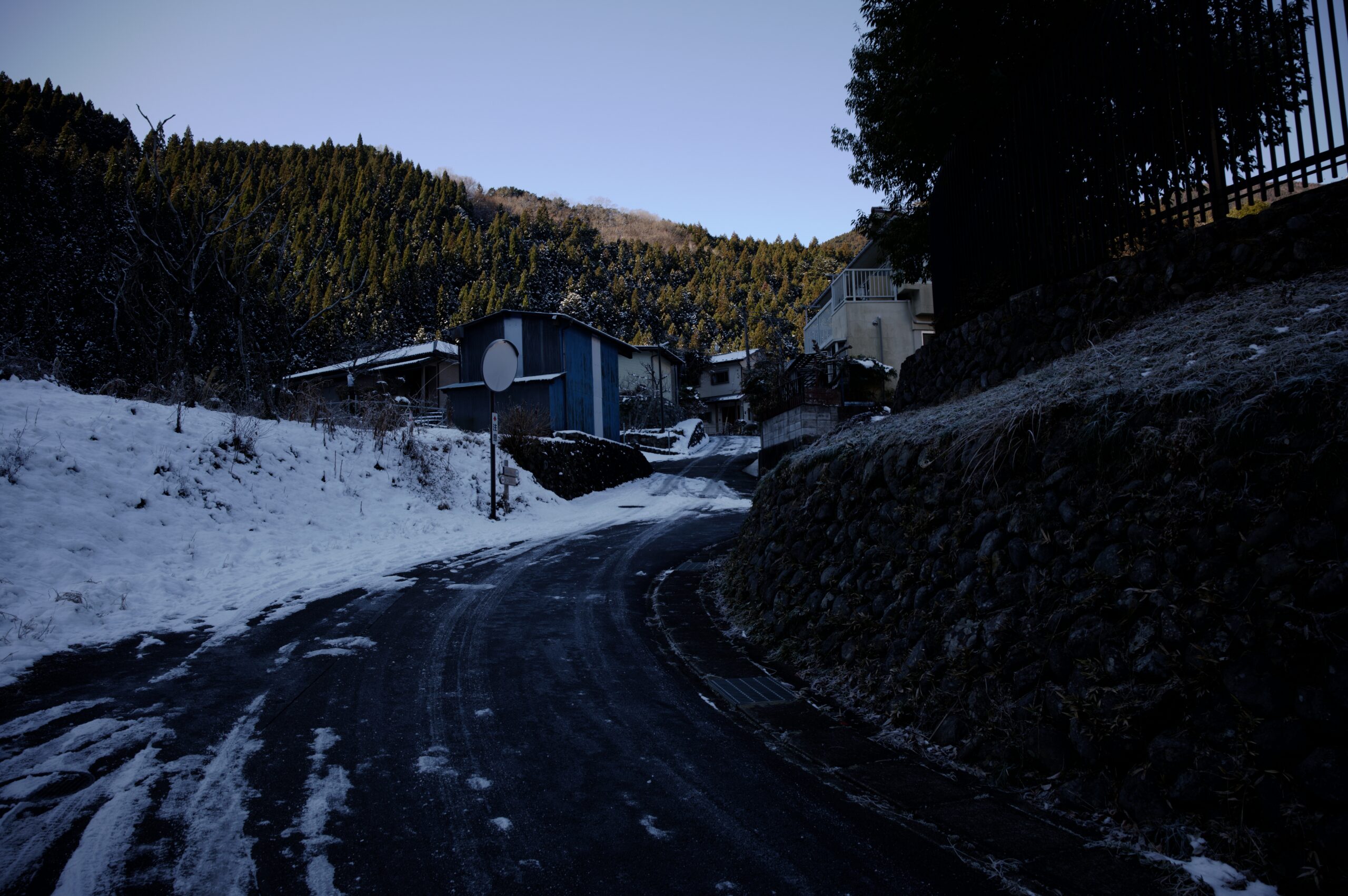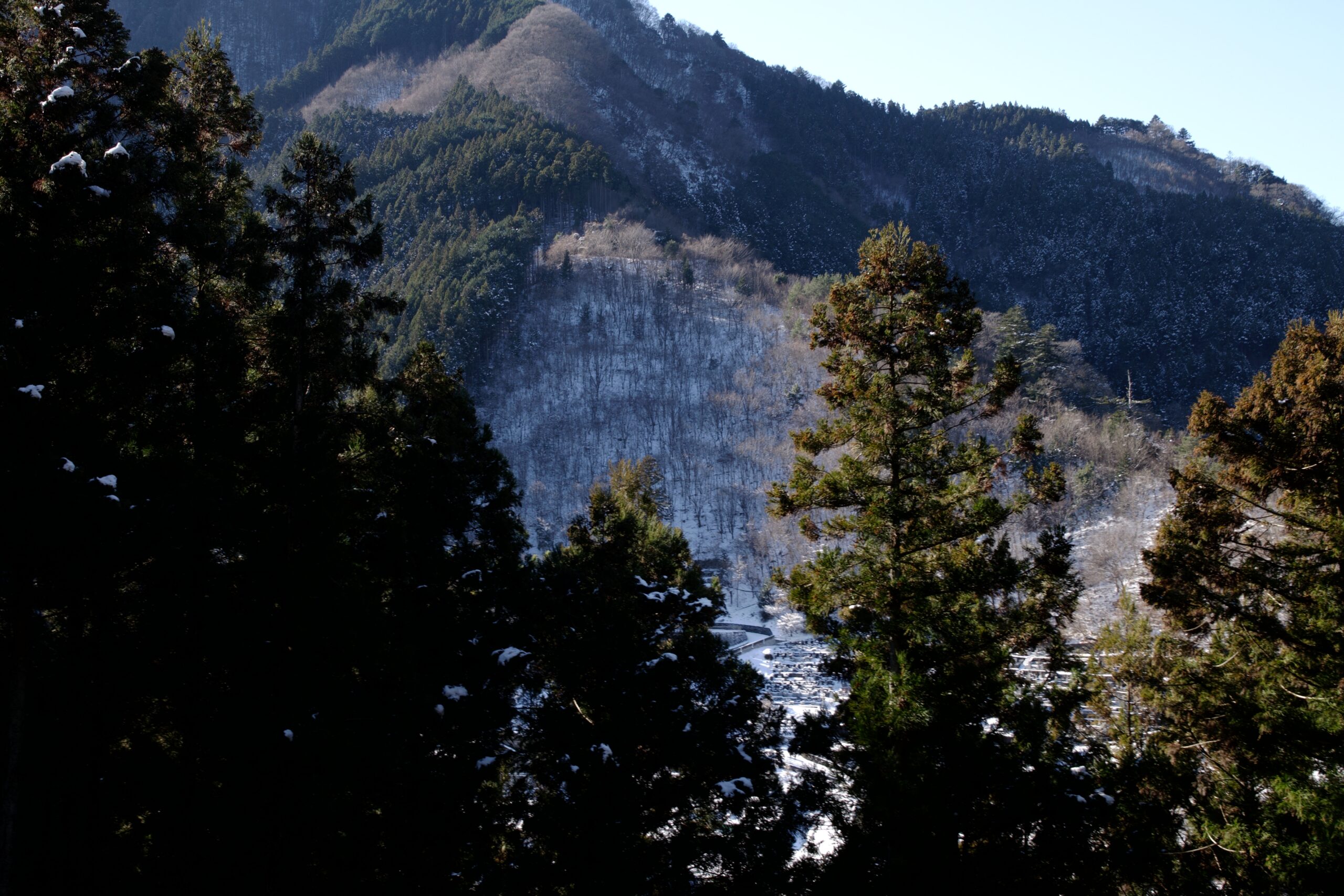 桧村浄水所付近にやって来ると、一面に青白い世界が広がっていました。大岳山や御前山の日陰になっていて、まるで氷の世界です。