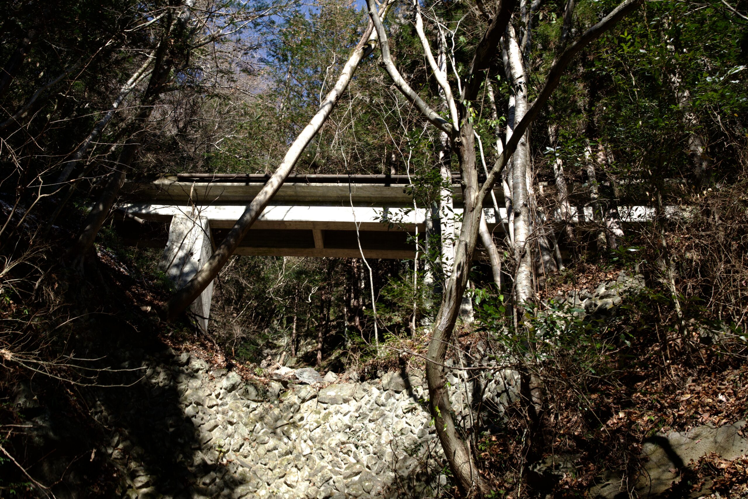 林道が白髭トンネルに近づくと、だいぶ高い位置に架かるコンクリートの鉄道橋が見えてきます。