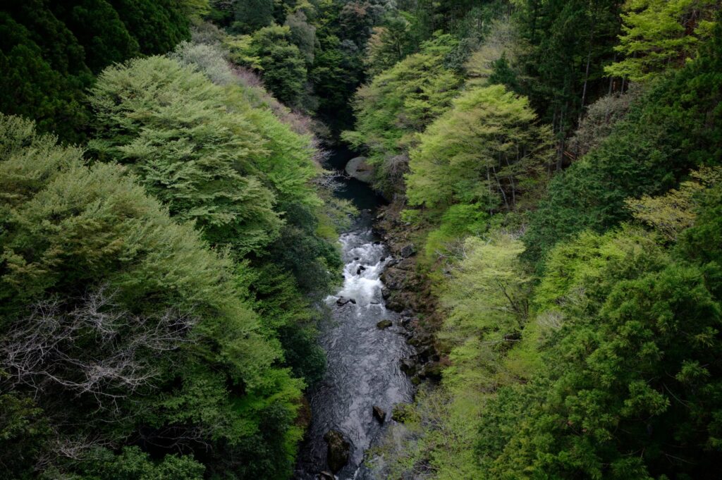 境橋から見下ろした渓相。深緑と水の流れが美しい。