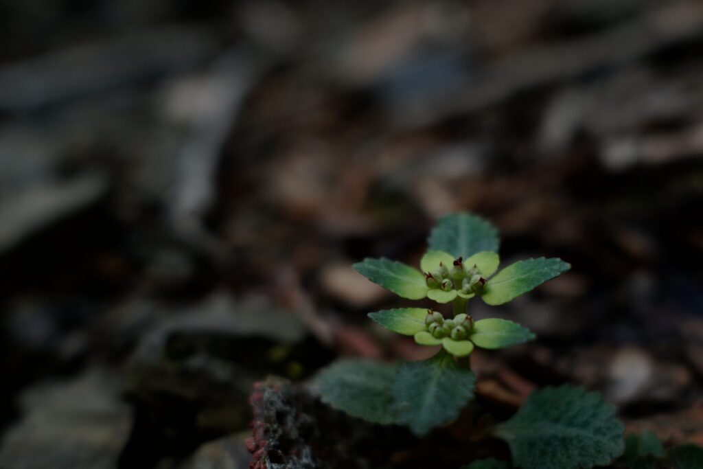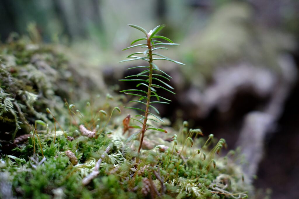 倒木に生える苔と謎の植物。