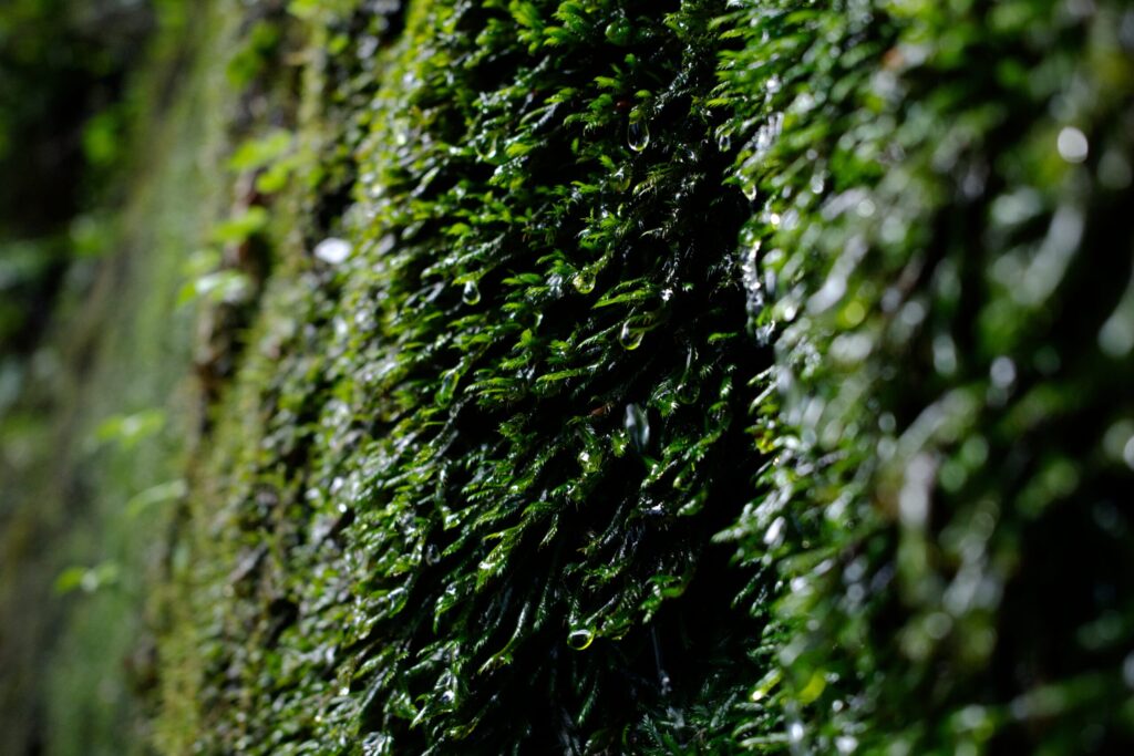 石壁の苔。山肌からは水が染みだします。地下水は豊富なよう。