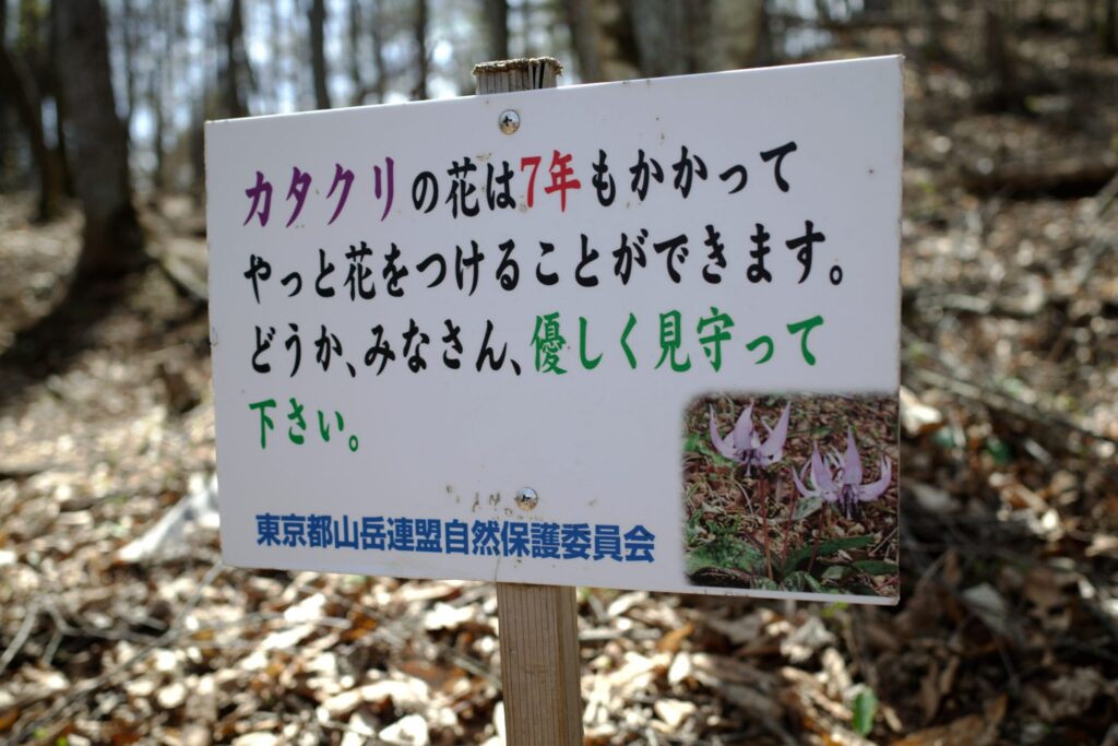 カタクリの群生は、多くの都道府県でレッドリストに登録されています。御前山の群生も、また然り。山から自然の楽しさを授受している一登山者として、いつまでも御前山にカタクリの群生が咲き誇ることを願う次第です。