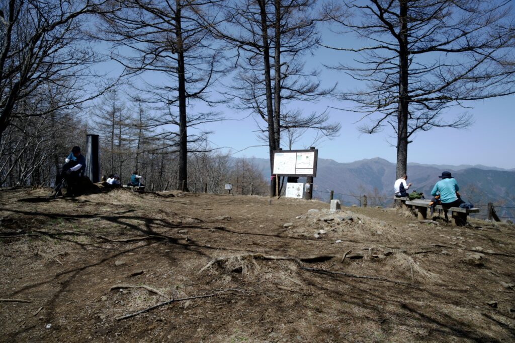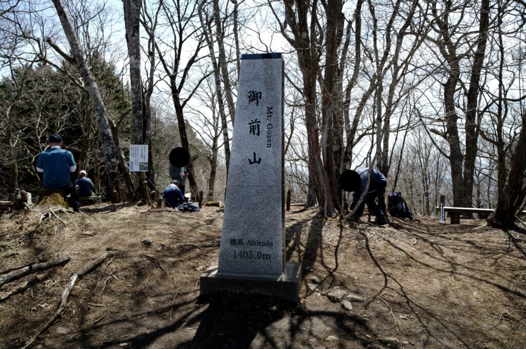 ゆっくり歩いて、おおよそ15分。御前山山頂に到着。既にベンチは満員の様子。